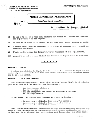 Barrière de dégel Resumé Pièces jointes ARRETE Assemblée : Non défini Date : 28/01/1998 Rapporteur : Non défini Collectivité : Conseil départemental du Haut-Rhin Direction : Non défini Service : Direction des Routes Domaine : Circulation Commission :