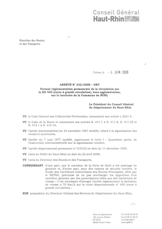 portant réglementation permanente de la circulation sur la RD 430 (route à grande circulation), hors agglomération, sur le territoire de la commune de BUHL. Resumé Pièces jointes ARRETE Assemblée : Non défini Date : 06/06/2008 Rapporteur : Non défini Collectivité : Conseil départemental du Haut-Rhin Direction : Non défini Service : Direction des Routes Domaine : Circulation Commission :