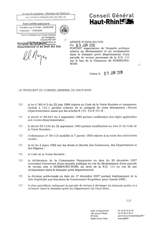 portant organisation de l'enquête publique relative au déclassement et au reclassement dans le domaine privé départemental d'une parcelle de terrain provenant de la RD 111 sur le ban de la commune de HORBOURG-WIHR. Resumé Pièces jointes ARRETE Assemblée : Non défini Date : 09/06/2008 Rapporteur : Non défini Collectivité : Conseil départemental du Haut-Rhin Direction : Non défini Service : Service du Patrimoine et du droit des Sols Domaine : Déclassement de voirie Commission :