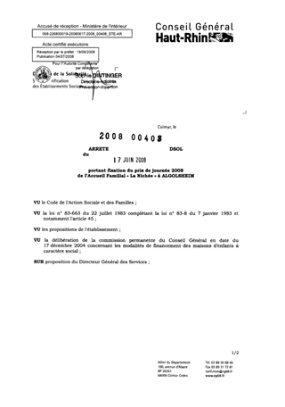 portant fixation du prix de journée 2008 de l'accueil familial "La Nichée" à ALGOLSHEIM. Resumé Pièces jointes ARRETE Assemblée : Non défini Date : 17/06/2008 Rapporteur : Non défini Collectivité : Conseil départemental du Haut-Rhin Direction : Non défini Service : Service de la Tarification des Etablissements Domaine : Prix de Journée Commission :