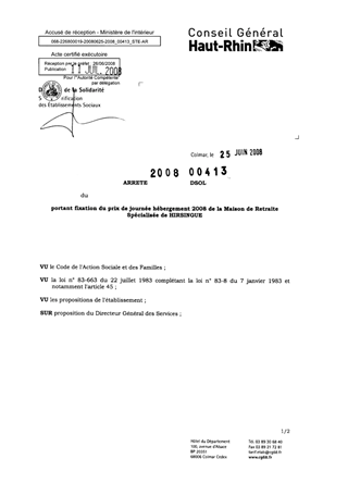 portant fixation du prix de journée hébergement 2008 de la maison de retraite spécialisée de HIRSINGUE. Resumé Pièces jointes ARRETE Assemblée : Non défini Date : 25/06/2008 Rapporteur : Non défini Collectivité : Conseil départemental du Haut-Rhin Direction : Non défini Service : Service de la Tarification des Etablissements Domaine : Prix de Journée Commission :