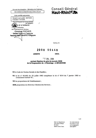 portant fixation du prix de journée 2008 de la Pouponnière de "l'Ermitage" à MULHOUSE. Resumé Pièces jointes ARRETE Assemblée : Non défini Date : 08/07/2008 Rapporteur : Non défini Collectivité : Conseil départemental du Haut-Rhin Direction : Non défini Service : Service de la Tarification des Etablissements Domaine : Prix de Journée Commission :