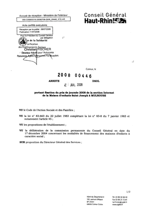 portant fixation du prix de journée 2008 de la section internat de la maison d'enfants Saint Joseph à MULHOUSE. Resumé Pièces jointes ARRETE Assemblée : Non défini Date : 08/07/2008 Rapporteur : Non défini Collectivité : Conseil départemental du Haut-Rhin Direction : Non défini Service : Service de la Tarification des Etablissements Domaine : Prix de Journée Commission :