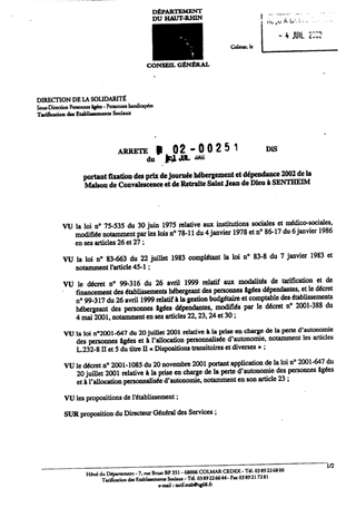 Portant fixation des prix de journée hébergement et dépendance 2002 de la Maison de Convalescence et de Retraite Saint Jean de Dieu à SENTHEIM Resumé Pièces jointes ARRETE Assemblée : Non défini Date : 01/07/2002 Rapporteur : Non défini Collectivité : Conseil départemental du Haut-Rhin Direction : Non défini Service : Service de la Tarification des Etablissements Domaine : Prix de Journée Commission :