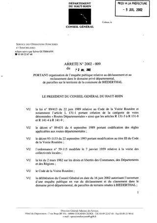 Organisation de l'enquete publique relative au déclassement et au reclassement dans le domaine privé départemental, de parcelles sur le territoire de la commune de BIEDERTHAL Resumé Pièces jointes ARRETE Assemblée : Non défini Date : 02/07/2002 Rapporteur : Non défini Collectivité : Conseil départemental du Haut-Rhin Direction : Non défini Service : Unité Foncière Domaine : Déclassement de voirie Commission :