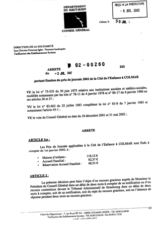Portant fixation des prix de la journée 2002 de la Cité de l' Enfance à COLMAR Resumé Pièces jointes ARRETE Assemblée : Non défini Date : 03/07/2002 Rapporteur : Non défini Collectivité : Conseil départemental du Haut-Rhin Direction : Non défini Service : Service de la Tarification des Etablissements Domaine : Prix de Journée Commission :