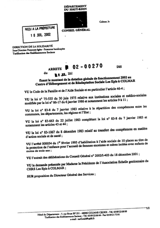 Fixant le montant de la dotaion globale de fonctionnement 2002 au centre d'Hébergement et de Réadaptation Social Les Epis à COLMAR Resumé Pièces jointes ARRETE Assemblée : Non défini Date : 06/07/2002 Rapporteur : Non défini Collectivité : Conseil départemental du Haut-Rhin Direction : Non défini Service : Service de la Tarification des Etablissements Domaine : Dotations financières Commission :