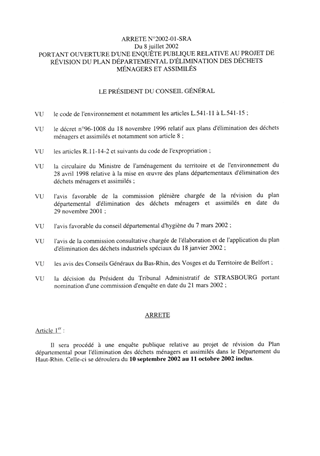 Ouverture d'une enquête publique relative au projet de révision du plan départemental d'élimination des déchets ménagers et assimilés Resumé Pièces jointes ARRETE Assemblée : Non défini Date : 08/07/2002 Rapporteur : Non défini Collectivité : Conseil départemental du Haut-Rhin Direction : Non défini Service : Service Energie et Recyclage Domaine : Autres (non classés) Commission :