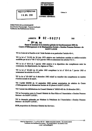Fixant le montant de la dotation globale de fonctionnement 2002 du Centre d'Hébergement et de Réadaptation Sociale "Soutien Femmes Battues" de SAINT-LOUIS Resumé Pièces jointes ARRETE Assemblée : Non défini Date : 16/07/2002 Rapporteur : Non défini Collectivité : Conseil départemental du Haut-Rhin Direction : Non défini Service : Service de la Tarification des Etablissements Domaine : Dotations financières Commission :