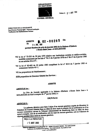 portant fixation du prix de journée 2002 de la Maison d'Enfants « Home Saint Jean » à MULHOUSE Resumé Pièces jointes ARRETE Assemblée : Non défini Date : 24/07/2002 Rapporteur : Non défini Collectivité : Conseil départemental du Haut-Rhin Direction : Non défini Service : Service de la Tarification des Etablissements Domaine : Prix de Journée Commission :