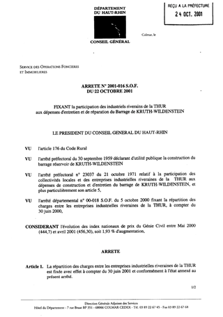 Fixant la participation des industriels riverains de la Thur aux dépenses d'entretien et de réparation du barrage de Kruth-Wildenstein Resumé Pièces jointes ARRETE Assemblée : Non défini Date : 01/11/2001 Rapporteur : Non défini Collectivité : Conseil départemental du Haut-Rhin Direction : Non défini Service : Service du Patrimoine et du droit des Sols Domaine : Barrages Commission :