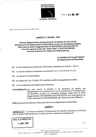 Portant réglementation permanente de la circulation sur une voie du domaine privé du Département du Haut-Rhin, ouverte à la circulation publique, située entre la limite d'agglomération de HUSSEREN-LES-CHATEAUX et le lycée agricole au lieu-dit "Saint-Gille