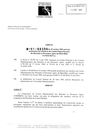 Portant nomination des membres du Comité départemental des retraités et personnes agées du Haut-Rhin C.O.D.E.R.P.A. Resumé Pièces jointes ARRETE Assemblée : Non défini Date : 05/11/2001 Rapporteur : Non défini Collectivité : Conseil départemental du Haut-Rhin Direction : Non défini Service : Direction Adjointe Personnes Agées et Personnes Handicapées Domaine : Personnes Agées Commission :