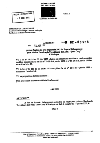 portant fixation du prix de journée 2002 du Foyer d’hébergement Resumé Pièces jointes ARRETE Assemblée : Non défini Date : 02/08/2002 Rapporteur : Non défini Collectivité : Conseil départemental du Haut-Rhin Direction : Non défini Service : Service de la Tarification des Etablissements Domaine : Prix de Journée Commission :