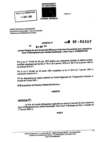 portant fixation du prix de journée 2002 pour le Service d’Accueil de Jour rattaché au foyer d’hébergement pour adultes handicapés « Jean Cuny » à HIRSINGUE Resumé Pièces jointes ARRETE Assemblée : Non défini Date : 07/08/2002 Rapporteur : Non défini Collectivité : Conseil départemental du Haut-Rhin Direction : Non défini Service : Service de la Tarification des Etablissements Domaine : Prix de Journée Commission :