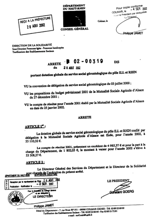 portant dotation globale du service social gérontologique du pôle ILL et RHIN Resumé Pièces jointes ARRETE Assemblée : Non défini Date : 28/08/2002 Rapporteur : Non défini Collectivité : Conseil départemental du Haut-Rhin Direction : Non défini Service : Service de la Tarification des Etablissements Domaine : Personnes Agées Commission :
