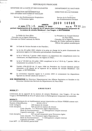 portant régularisation de la capacité de 67 places dont 2 d'hébergement temporaire de la maison de retraite Résidence "Les Vosges" à WITTENHEIM. Resumé Pièces jointes ARRETE Assemblée : Non défini Date : 28/09/2009 Rapporteur : Non défini Collectivité : Conseil départemental du Haut-Rhin Direction : Non défini Service : Direction de l'Autonomie Domaine : Autres (non classés) Commission :