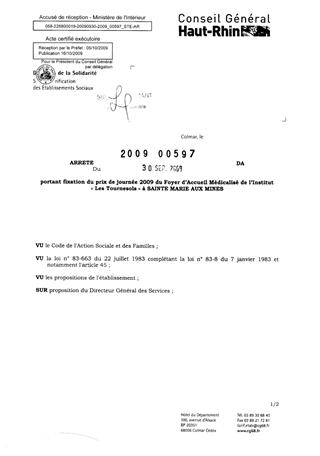 portant fixation du prix de journée 2009 du foyer d'accueil médicalisé de l'Institut "Les Tournesols" à SAINTE MARIE AUX MINES. Resumé Pièces jointes ARRETE Assemblée : Non défini Date : 30/09/2009 Rapporteur : Non défini Collectivité : Conseil départemental du Haut-Rhin Direction : Non défini Service : Direction de l'Autonomie Domaine : Prix de Journée Commission :