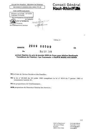 portant fixation du prix de journée 2009 du foyer pour adultes handicapés travailleurs de l'Institut "Les Tournesols" à SAINTE MARIE AUX MINES. Resumé Pièces jointes ARRETE Assemblée : Non défini Date : 30/09/2009 Rapporteur : Non défini Collectivité : Conseil départemental du Haut-Rhin Direction : Non défini Service : Direction de l'Autonomie Domaine : Prix de Journée Commission :