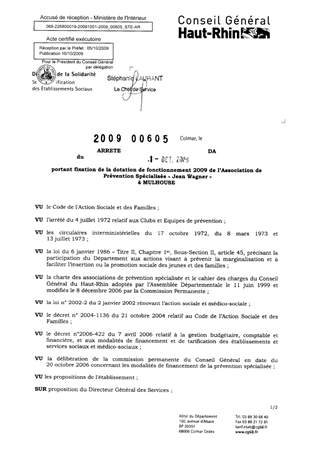 portant fixation de la dotation de fonctionnement 2009 de l'association de prévention spécialisée "Jean Wagner" à MULHOUSE. Resumé Pièces jointes ARRETE Assemblée : Non défini Date : 01/10/2009 Rapporteur : Non défini Collectivité : Conseil départemental du Haut-Rhin Direction : Non défini Service : Direction de l'Autonomie Domaine : Dotations financières Commission :