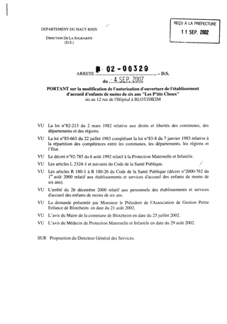 PORTANT sur la modification de l'autorisation d'ouverture de l'établissement d'accueil d'enfants de moins de six ans "Les P'tits Choux"sis au 12 rue de l'Hôpital à BLOTZHEIM Resumé Pièces jointes ARRETE Assemblée : Non défini Date : 04/09/2002 Rapporteur : Non défini Collectivité : Conseil départemental du Haut-Rhin Direction : Non défini Service : Direction de la Solidarité Domaine : Accueil d'enfants Commission :