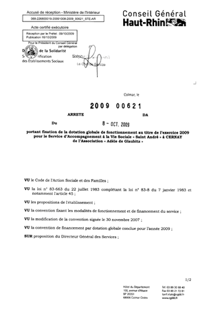 portant fixation de la dotation globale de fonctionnement au titre de l'exercice 2009 pour le service d'accompagnement à la vie sociale "Saint André" à CERNAY de l'association "Adèle de Glaubitz". Resumé Pièces jointes ARRETE Assemblée : Non défini Date : 08/10/2009 Rapporteur : Non défini Collectivité : Conseil départemental du Haut-Rhin Direction : Non défini Service : Direction de l'Autonomie Domaine : Dotations financières Commission :