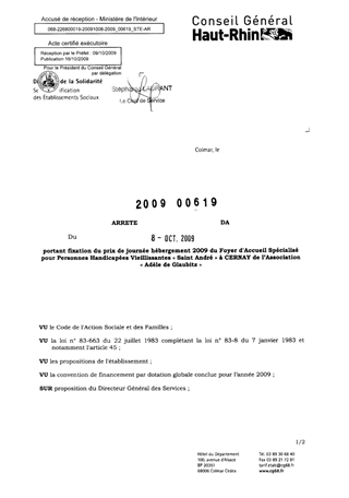 portant fixation du prix de journée hébergement 2009 du foyer d'accueil spécialisé pour personnes handicapées vieillissantes "Saint André" à CERNAY de l'Association "Adèle de Glaubitz". Resumé Pièces jointes ARRETE Assemblée : Non défini Date : 08/10/2009 Rapporteur : Non défini Collectivité : Conseil départemental du Haut-Rhin Direction : Non défini Service : Direction de l'Autonomie Domaine : Prix de Journée Commission :