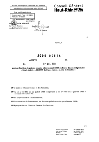 portant fixation du prix de journée hébergement 2009 du foyer d'accueil spécialisé "Saint André" à CERNAY de l'associatio "Adèle de Glaubitz". Resumé Pièces jointes ARRETE Assemblée : Non défini Date : 08/10/2009 Rapporteur : Non défini Collectivité : Conseil départemental du Haut-Rhin Direction : Non défini Service : Direction de l'Autonomie Domaine : Prix de Journée Commission :