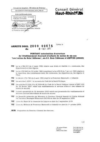 portant autorisation d'ouverture de l'établissement d'accueil d'enfants de moins de six ans "Les Lutins du Bois l'Abbesse", sis Z.I. Bois l'Abbesse à LIEPVRE (68660). Resumé Pièces jointes ARRETE Assemblée : Non défini Date : 08/10/2009 Rapporteur : Non défini Collectivité : Conseil départemental du Haut-Rhin Direction : Non défini Service : Direction Enfance Santé Insertion Domaine : Accueil d'enfants Commission :