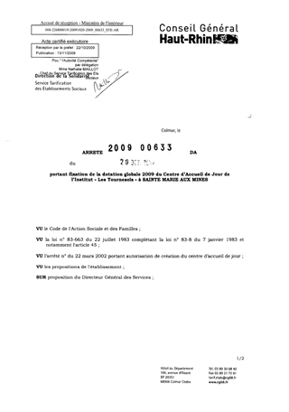 portant fixation de la dotation globale 2009 du centre d'accueil de jour de l'institut "Les Tournesols" à SAINTE MARIE AUX MINES. Resumé Pièces jointes ARRETE Assemblée : Non défini Date : 20/10/2009 Rapporteur : Non défini Collectivité : Conseil départemental du Haut-Rhin Direction : Non défini Service : Direction de l'Autonomie Domaine : Dotations financières Commission :