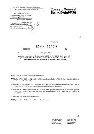 portant complément de l'arrêté n°2009-00520-DSOL du 07.08.2009 portant fixation du prix de journée du centre d'accueil de jour de l'Association des Paralysés de France à MULHOUSE. Resumé Pièces jointes ARRETE Assemblée : Non défini Date : 26/10/2009 Rapporteur : Non défini Collectivité : Conseil départemental du Haut-Rhin Direction : Non défini Service : Direction de l'Autonomie Domaine : Prix de Journée Commission :
