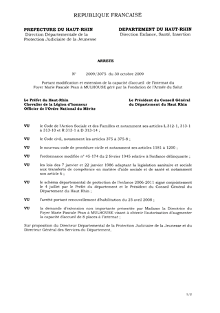 portant modification et extension de la capacité d'accueil de l'internat du foyer Marie Pascale Péan à MULHOUSE géré par la Fondation de l'Armée du Salut. Resumé Pièces jointes ARRETE Assemblée : Non défini Date : 30/10/2009 Rapporteur : Non défini Collectivité : Conseil départemental du Haut-Rhin Direction : Non défini Service : Direction Enfance Santé Insertion Domaine : Autres (non classés) Commission :