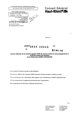 portant fixation de la dotation globale 2009 du service d'aide et d'accompagnement à domicile auprès des familles de la Fédération ADMR à MULHOUSE. Resumé Pièces jointes ARRETE Assemblée : Non défini Date : 02/11/2009 Rapporteur : Non défini Collectivité : Conseil départemental du Haut-Rhin Direction : Non défini Service : Direction de l'Autonomie Domaine : Dotations financières Commission :