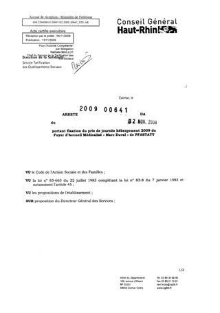 portant fixation du prix de journée hébergement 2009 du foyer d'accueil médicalisé "Marc Duval" de PFASTATT. Resumé Pièces jointes ARRETE Assemblée : Non défini Date : 02/11/2009 Rapporteur : Non défini Collectivité : Conseil départemental du Haut-Rhin Direction : Non défini Service : Direction de l'Autonomie Domaine : Prix de Journée Commission :