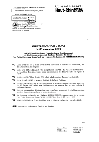 portant modification de l'autorisation de fonctionnement de l'établissement d'accueil d'enfants de moins de six ans "Les Petits Chaperons Rouges", sis au 41 rue du Vieil Armand à WITTENHEIM (68270). Resumé Pièces jointes ARRETE Assemblée : Non défini Date : 06/11/2009 Rapporteur : Non défini Collectivité : Conseil départemental du Haut-Rhin Direction : Non défini Service : Direction Enfance Santé Insertion Domaine : Accueil d'enfants Commission :