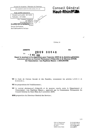fixant le montant et la répartition pour l'exercice 2009 de la dotation globalisée commune prévue au contrat pluriannuel d'objectifs et de moyens (CPOM) de l'Association "Les Papillons Blancs" à MULHOUSE. Resumé Pièces jointes ARRETE Assemblée : Non défini Date : 09/11/2009 Rapporteur : Non défini Collectivité : Conseil départemental du Haut-Rhin Direction : Non défini Service : Direction de l'Autonomie Domaine : Dotations financières Commission :