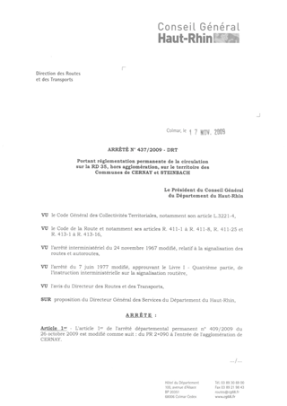 portant réglementation permanente de la circulation sur la RD 35, hors agglomération, sur le territoire des communes de CERNAY et STEINBACH. Resumé Pièces jointes ARRETE Assemblée : Non défini Date : 17/11/2009 Rapporteur : Non défini Collectivité : Conseil départemental du Haut-Rhin Direction : Non défini Service : Direction des Routes Domaine : Circulation Commission :