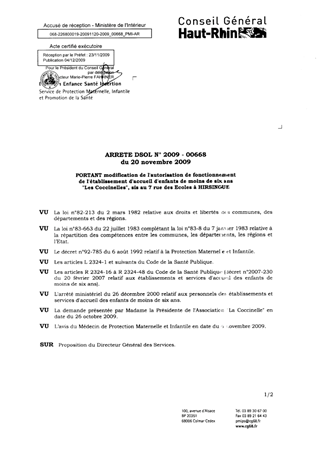 portant modification de l'autorisation de fonctionnement de l'établissement d'accueil d'enfants de moins de six ans "Les Coccinelles", sis au 7 rue des Ecoles à HIRSINGUE. Resumé Pièces jointes ARRETE Assemblée : Non défini Date : 20/11/2009 Rapporteur : Non défini Collectivité : Conseil départemental du Haut-Rhin Direction : Non défini Service : Direction Enfance Santé Insertion Domaine : Accueil d'enfants Commission :