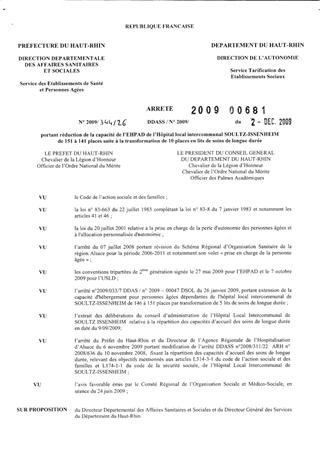 portant réduction de la capacité de l'EHPAD de l'hôpital local intercommunal SOULTZ-ISSENHEIM de 151 à 141 places suite à la transformation de 10 places en lits de soins de longue durée. Resumé Pièces jointes ARRETE Assemblée : Non défini Date : 02/12/2009 Rapporteur : Non défini Collectivité : Conseil départemental du Haut-Rhin Direction : Non défini Service : Direction de l'Autonomie Domaine : Autres (non classés) Commission :