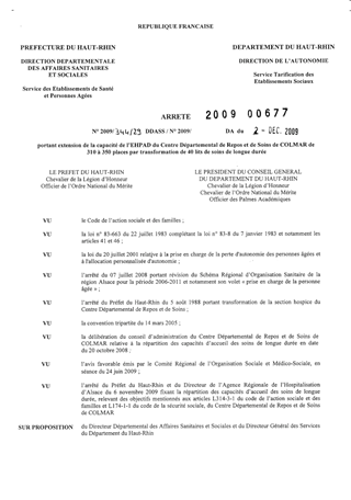 portant extension de la capacité de l'EHPAD du centre départemental de repos et de soins de COLMAR de 310 à 350 places par transformation de 40 lits de soins de longue durée. Resumé Pièces jointes ARRETE Assemblée : Non défini Date : 02/12/2009 Rapporteur : Non défini Collectivité : Conseil départemental du Haut-Rhin Direction : Non défini Service : Direction de l'Autonomie Domaine : Autres (non classés) Commission :