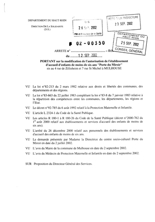 portant sur la modification de l'autorisation de l'établissement d'accueil d'enfants du moins de six ans "Porte du Miroir" sis au 4 rue de Zillisheim et 7 rue St Michel à MULHOUSE Resumé Pièces jointes ARRETE Assemblée : Non défini Date : 12/09/2002 Rapporteur : Non défini Collectivité : Conseil départemental du Haut-Rhin Direction : Non défini Service : Direction de la Solidarité Domaine : Accueil d'enfants Commission :