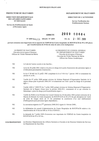 portant extension non importante de la capacité de l'EHPAD du centre hospitalier de ROUFFACH de 95 à 105 places par transformation de 10 lits de soins de suite et de réadaptation. Resumé Pièces jointes ARRETE Assemblée : Non défini Date : 02/12/2009 Rapporteur : Non défini Collectivité : Conseil départemental du Haut-Rhin Direction : Non défini Service : Direction de l'Autonomie Domaine : Autres (non classés) Commission :