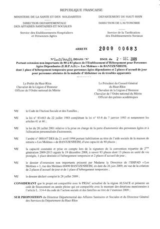 portant extension non importante de 80 à 83 places de l'établissement d'hébergement pour personnes âgées dépendantes (EHPAD) "Les Molènes" de BANTZENHEIM, dont 1 place d'hébergement temporaire pour personnes âgées dépendantes et 2 places d'accueil de jour