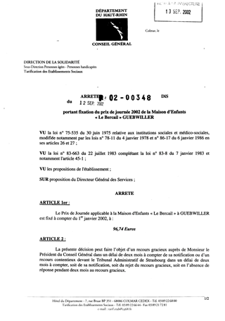 portant fixation du prix de journée 2002 de la Maison d'Enfants « Le Bercail » GUEBWILLER Resumé Pièces jointes ARRETE Assemblée : Non défini Date : 12/09/2002 Rapporteur : Non défini Collectivité : Conseil départemental du Haut-Rhin Direction : Non défini Service : Service de la Tarification des Etablissements Domaine : Dotations financières Commission :