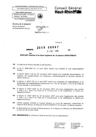 portant création d'un foyer logement de 16 places à SOULTZMATT. Resumé Pièces jointes ARRETE Assemblée : Non défini Date : 15/12/2009 Rapporteur : Non défini Collectivité : Conseil départemental du Haut-Rhin Direction : Non défini Service : Direction de l'Autonomie Domaine : Autres (non classés) Commission :