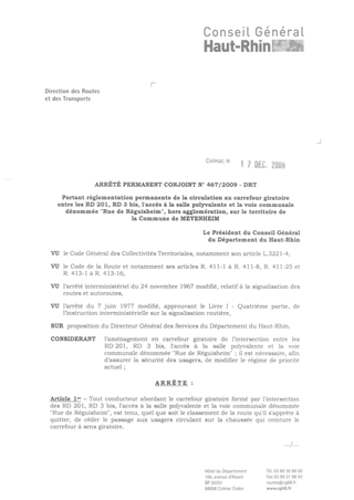 portant réglementation permanente de la circulation au carrefour giratoire entre les RD 201, RD 3 bis, l'accès à la salle polyvalente et la voie communale dénommée "Rue de Réguisheim", hors agglomération, sur le territoire de la commune de MEYENHEIM.