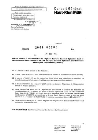 portant refus de la transformation de 10 places du foyer d'accueil spécialisé (FAS) de l'établissement Saint Joseph de THANN en foyer d'accueil spécialisé pour personnes handicapées vieillissantes (FASPHV). Resumé Pièces jointes ARRETE Assemblée : Non défini Date : 21/12/2009 Rapporteur : Non défini Collectivité : Conseil départemental du Haut-Rhin Direction : Non défini Service : Direction de l'Autonomie Domaine : Autres (non classés) Commission :