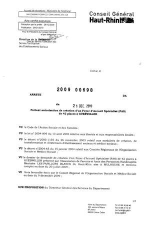 portant autorisation de création d'un foyer d'accueil spécialisé (FAS) de 42 places à GUEBWILLER. Resumé Pièces jointes ARRETE Assemblée : Non défini Date : 21/12/2009 Rapporteur : Non défini Collectivité : Conseil départemental du Haut-Rhin Direction : Non défini Service : Direction de l'Autonomie Domaine : Autres (non classés) Commission :