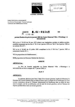 portant fixation du prix de journée 2002 du Centre Maternel Ville "l'Ermitage" à Mulhouse Resumé Pièces jointes ARRETE Assemblée : Non défini Date : 12/09/2002 Rapporteur : Non défini Collectivité : Conseil départemental du Haut-Rhin Direction : Non défini Service : Service de la Tarification des Etablissements Domaine : Prix de Journée Commission :