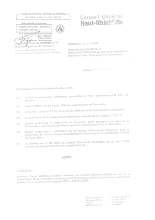 portant nomination du Président Délégué au sein de la Commission Départemental d'Aménagement Commercial. Resumé Pièces jointes ARRETE Assemblée : Non défini Date : 23/12/2009 Rapporteur : Non défini Collectivité : Conseil départemental du Haut-Rhin Direction : Non défini Service : Service Développement Economique Domaine : Autres (non classés) Commission :